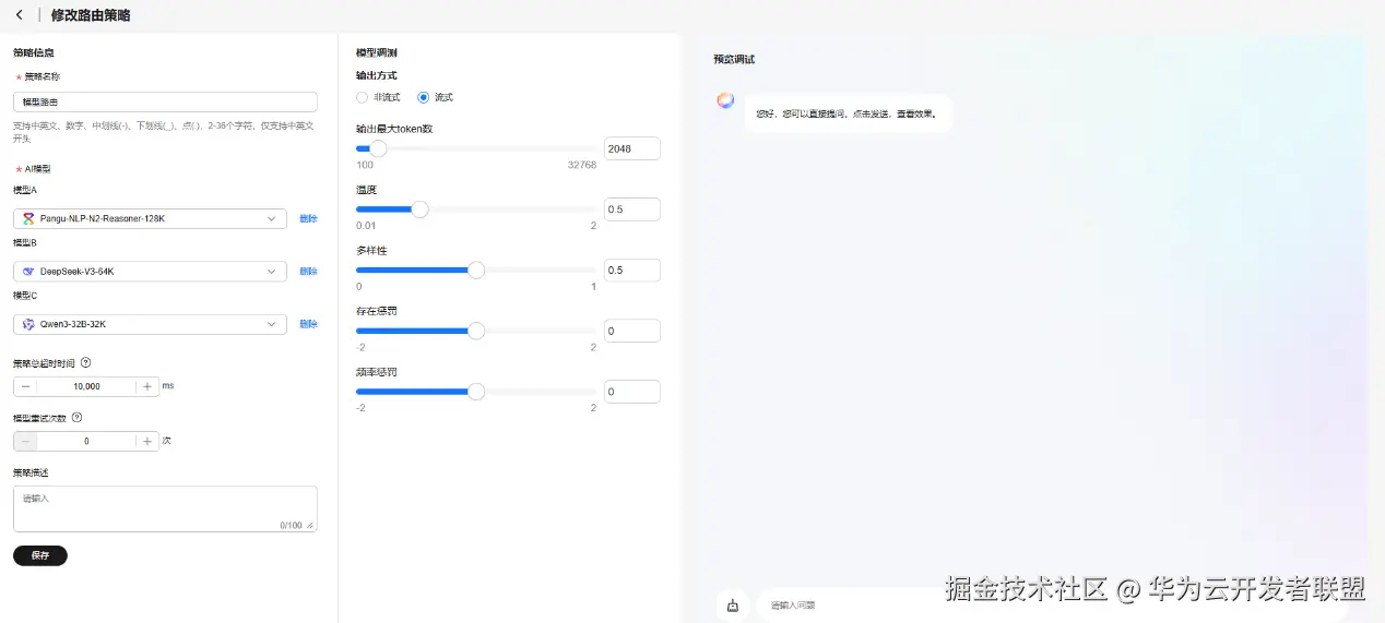 模型中心提供标准化API接口,支持盘古大模型与业界主流模型的接入与管理,提供多种路由策略,实现模型无感切换和灵活调度,支持NLP与多模态理解模型的在线调测及参数配置。