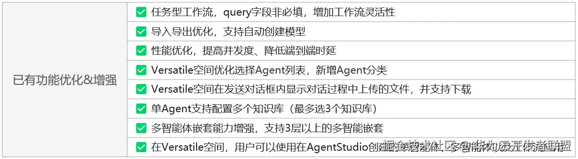 **Versatile 920版本总结:**新增27个特性,优化增强8个功能,新增多模态交互(图像、语音),新增敏感内容审查和风控,新增提示词管理,支持查看Trace调用链,查看使用量等统计指标,在运营运维、安全审查等企业级特性上有大幅提升。