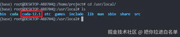 首先确定/usr/local/下面有没有刚才安装好的cuda 12.1, 可以看到如下:
