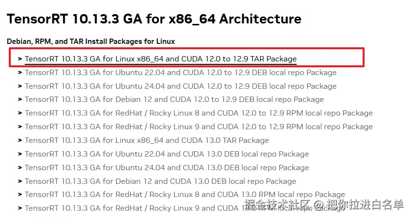 通过如下地址,可以下载到最新的TensorRT10的ubuntu 的包,然后选择对应的CUDA版本,我们是cuda 12.1,可以选择第一个tar包。