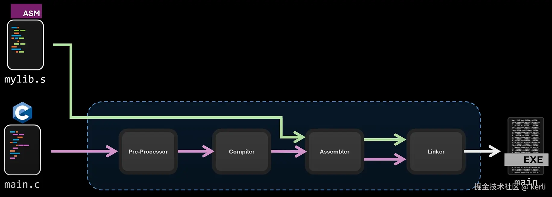 例如,我们可以自己写部分汇编代码 mylib.s,并将 main.c 先转化为汇编代码。在汇编阶段将 mylib.s、main.s 传给编译器,编译器会将它们混合成可执行文件。