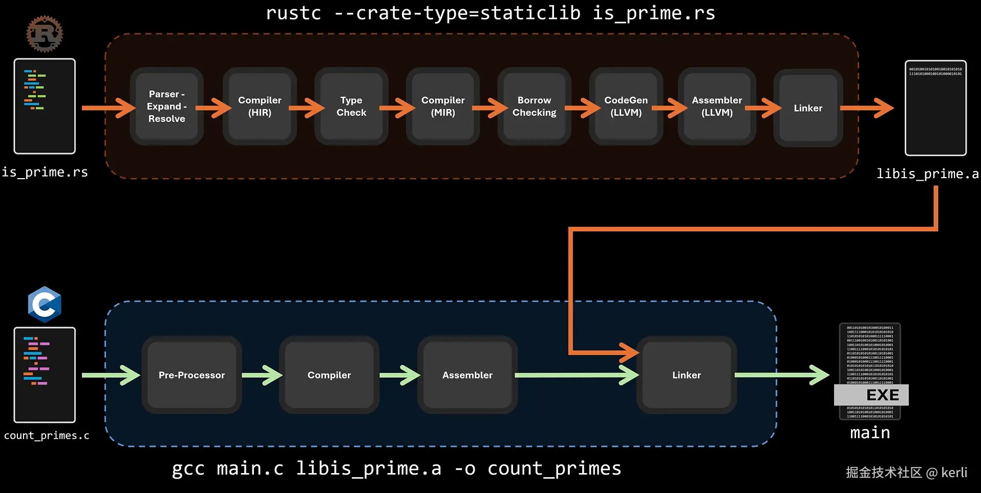 利用 Rust 的编译器,将其编译为静态库。然后将 汇编完成的 main.o、rust 静态库 统一交由链接器,最终生成可执行文件,内部包含二者的机器码。