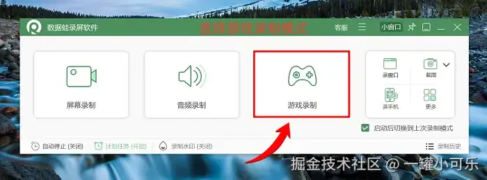 步骤1:先打开你要录的游戏,再启动数据 蛙录屏软件。刚进主界面,就能看到好几种录制模式。要录游戏就直接点击 “游戏录制” ,这模式是专门为游戏场景优化的。