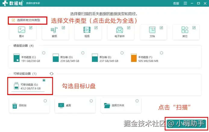 步骤1: 打开软件后直接进入扫描准备页面,根据提示勾选好目标文件类型,再勾选好U盘,就能点击“扫描”,让软件开始扫描工作;