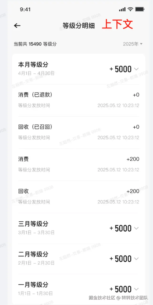 | 二级列表结构 | "消费(已退款)"字体样式为xxx,“等级分发放时间”字体样式为xxx,两者之间间距为8px,靠左展示。右侧内容上方为等级分数值,字体样式...,下方8px处为时间,字体样式为xxxxx | 无 | 无 |
