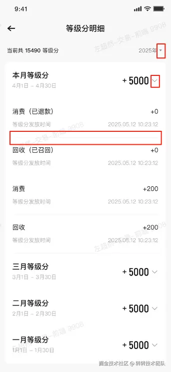 - 以“x月等级分”为一级标题,点击右侧可展开/收起;