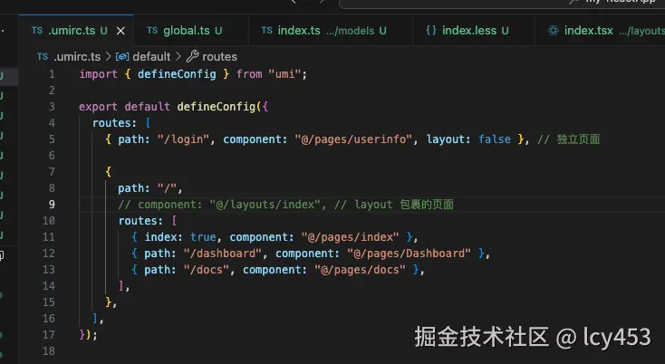 除了layout组件为独立页面,其他的页面都是默认被layout包裹的组件,这里index:true是默认展示index组件。