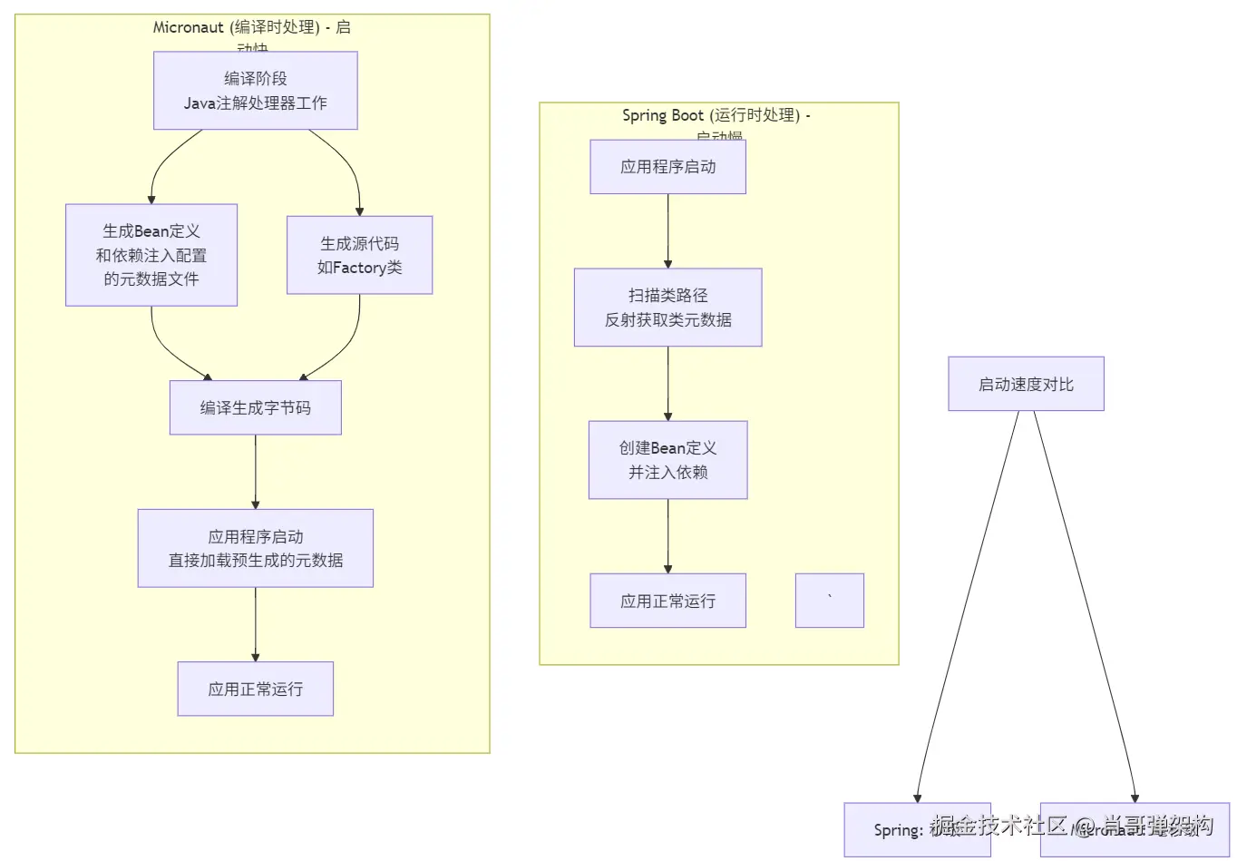 - 这是 Micronaut 与 Spring 等传统框架最大的不同。Spring 在应用启动时通过反射来扫描类路径、创建 Bean 定义并注入依赖,这个过程较慢。