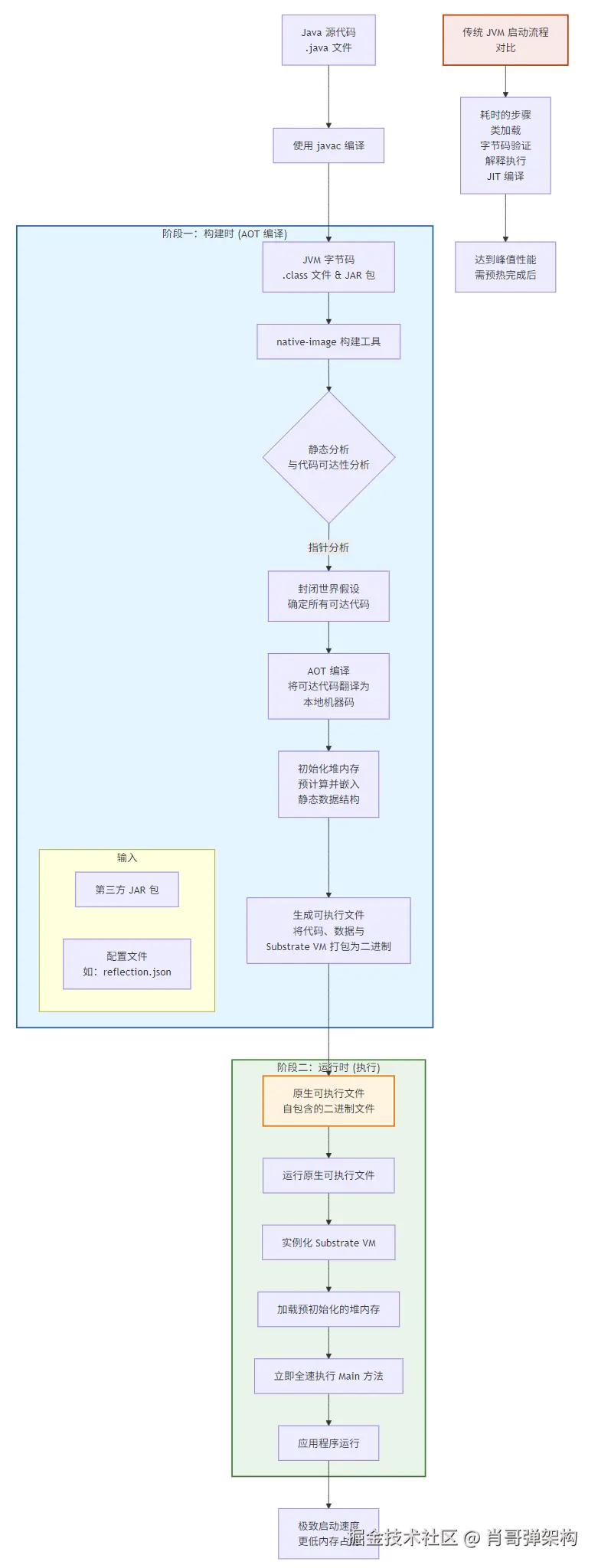作为对比,灰色框显示了传统 JVM 的启动过程:需要经历耗时的类加载、字节码验证、解释执行和渐进式的 JIT 编译,之后才能达到峰值性能。而 Native Image 牺牲了构建时间,换来了运行时的瞬时启动。