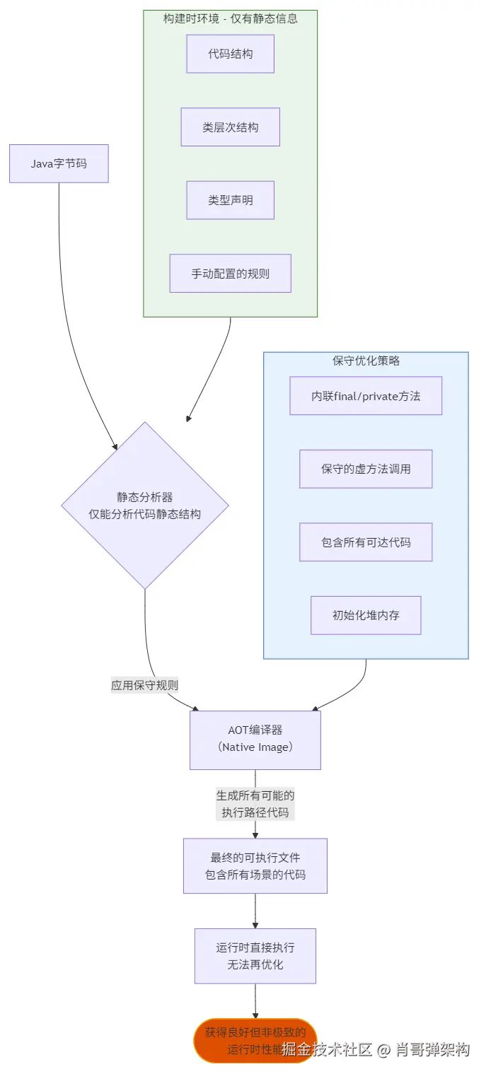 - 保守决策:AOT编译器无法做出大胆假设。它的优化策略非常保守(见图中的策略列表)。例如,对于一个虚方法,它不知道运行时具体是哪个实现类,因此只能编译成标准的、性能较低的虚方法调用指令。