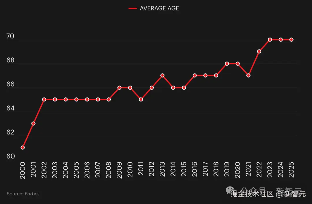 过去 25 年间,福布斯 400 富豪榜成员的平均年龄从 61 岁攀升至 70 岁,比 39 岁的美国人平均年龄整整大了三十岁。