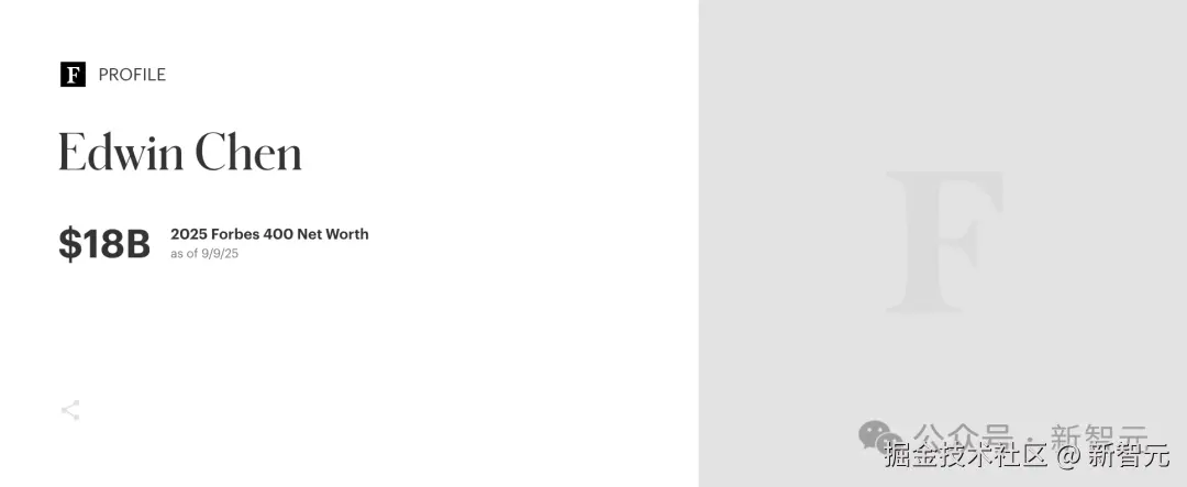 Edwin Chen 决定使用「自有资金」支持 Surge 的决策获得了丰厚回报:他持有的约 75% 股份估值约 180 亿美元,这足以使他成为今年福布斯美国 400 富豪榜上最富有的新晋成员。