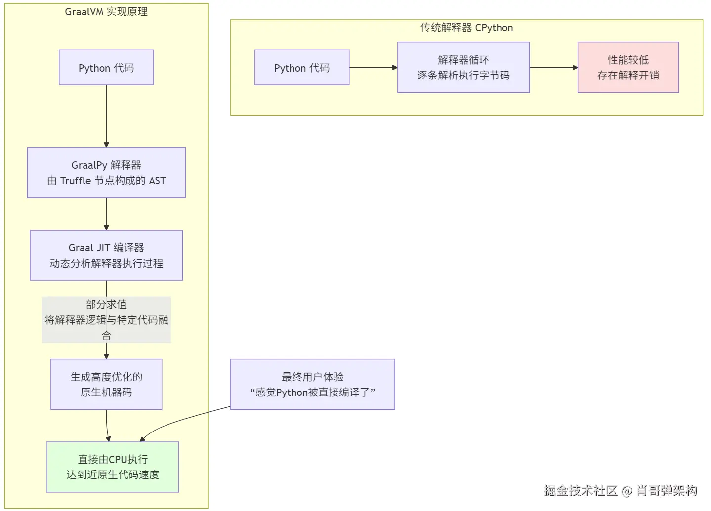 GraalPy 并没有直接将 Python 代码编译成原生代码。而是通过 Truffle 框架和 Graal JIT 编译器的协同工作,将解释器对特定Python代码的执行逻辑,动态地编译并优化成了原生机器码。 它通过部分求值技术,抹平了“解释器”和“被解释的程序”之间的界限,最终让Python代码以近乎原生代码的速度运行。