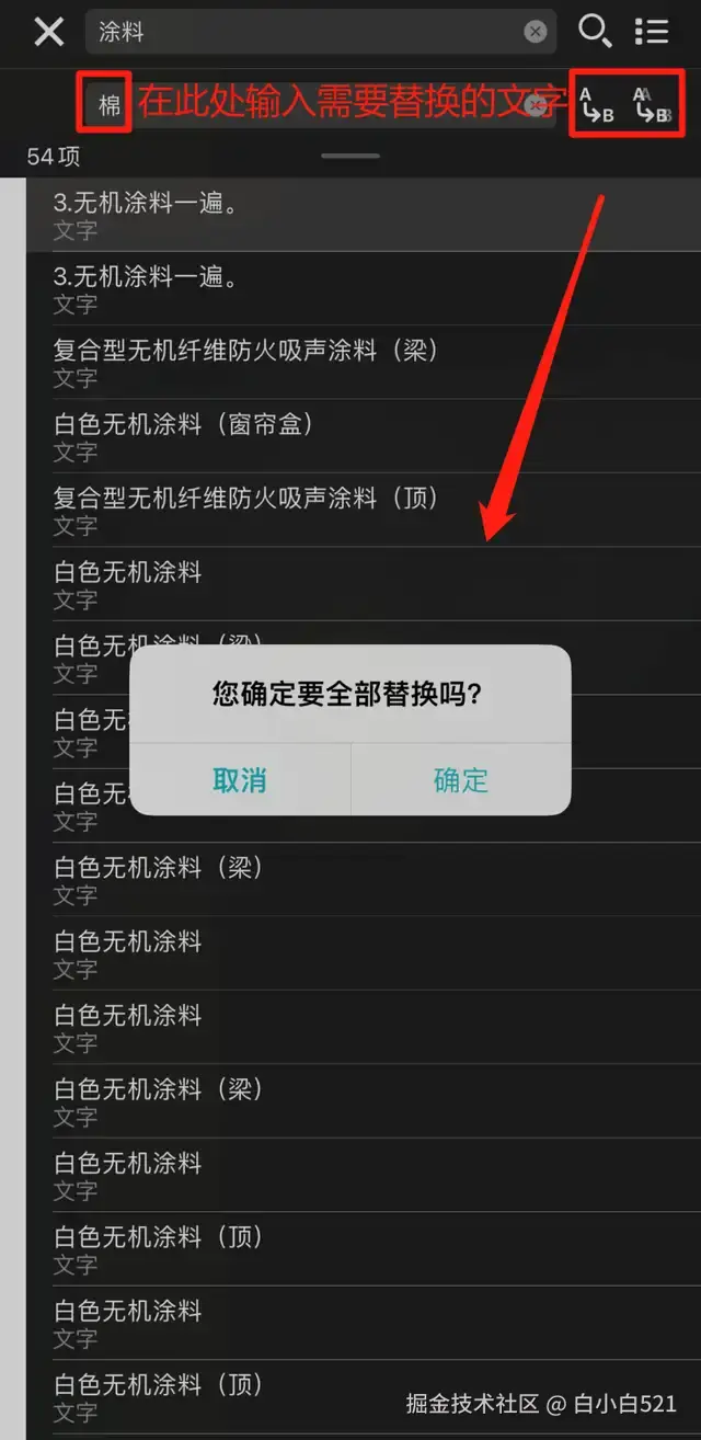 4、根据系统提示将要替换的文字输入至对应的文本框中,例如将图纸中的【涂料】替换成【棉】,点击【替换】按钮即可。如下图所示: