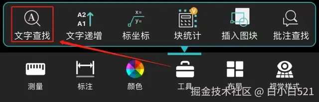 1、在手机中打开浩辰CAD看图王APP后,点击软件界面下方菜单栏中的【工具】按钮,在弹出的工具箱中点击【文字查找】功能。如下图所示: