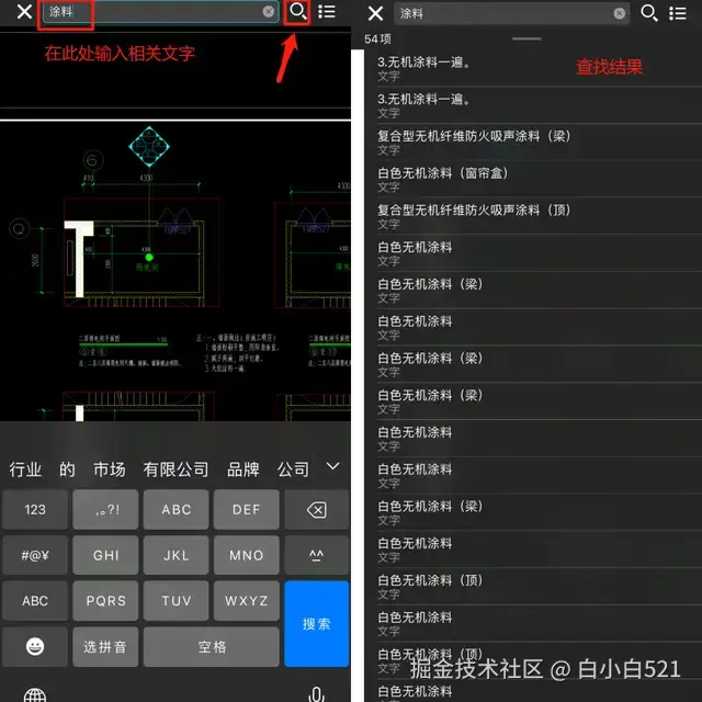 2、启用【文字查找】功能后,软件界面上方会显示搜索框,在搜索框中输入想要查询的文字,例如查找文字【涂料】,直接输入文字即可查询。如下图所示: