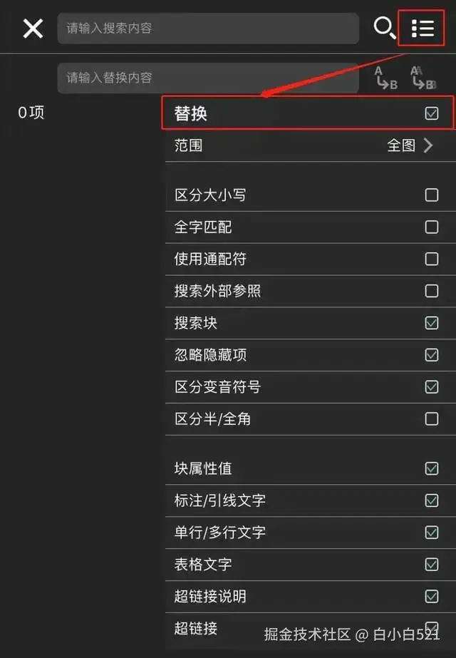 3、如果想要进行CAD文字替换,可以点击搜索框后的菜单按钮,在弹出的下拉菜单中玄策【替换】。如下图所示: