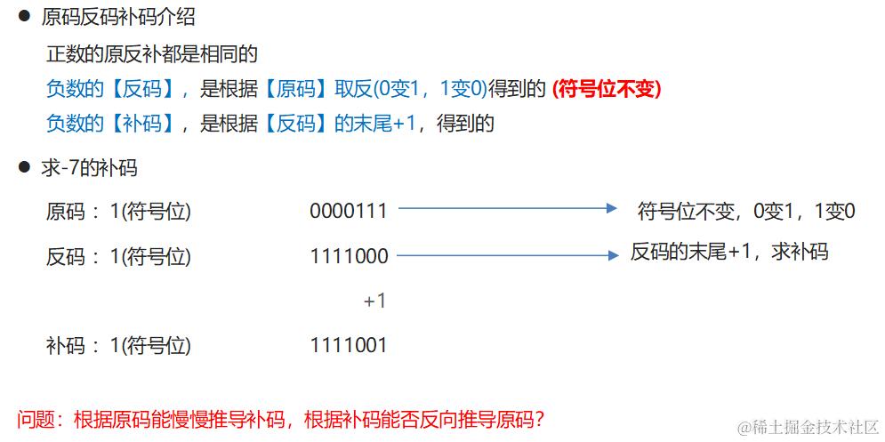 反码 : 正数的反码与其原码相同;负数的反码是对其原码逐位取反,但符号位除外。