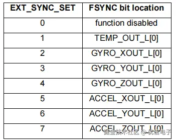 FIFO_MODE:控制 FIFO(数据缓冲区)在装满后如何处理新的数据。当FIFO_MODE = 0时,一旦FIFO装满,则新数据覆盖旧数据。FIFO_MODE = 1时,一旦FIFO满,则停止存储数据。 EXT_SYNC_SET[2:0]:配置外部同步,让芯片与外部触发信号同步采集数据。以下表为选择哪个传感器数据同步,其中000为禁用同步,001为温度数据同步,010-111分别为3轴陀螺仪、3轴加速度数据同步。