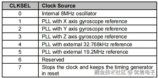 H_RESET:重置内部寄存器,并恢复默认设置。写一个1来设置重置位,该位将自动清除。即复位MPU9250。 SLEEP:设置MPU9250工作模式为休眠模式。 CYCLE:周期模式。当你在 PWR_MGMT_1 寄存器中设置了 CYCLE 位,同时确保 SLEEP 和 STANDBY 位没有被设置时,MPU9250 会进入一种低功耗工作模式。在这种模式下,芯片会不断地在“休眠”与“短暂唤醒采样”之间交替工作。每次唤醒时,它只会采集一个加速度计样本,而不是连续采集数据。采样的频率由 LP_ACCEL_ODR 寄存器来控制。注意:如果你通过 PWR_MGMT_2 寄存器禁用了所有加速度计的轴(也就是关闭了加速度计),那么即使启用了周期模式,芯片仍然会按照 LP_ACCEL_ODR 寄存器设定的时间间隔定时唤醒,但由于加速度计被禁用了,所以它不会采集任何数据。简单来说,就是启用周期模式时芯片周期性地从低功耗休眠状态中唤醒,采集一次数据,然后再回到休眠状态。如果禁用加速度计:芯片仍会周期性唤醒,但不会采集数据。 GYRO_STANDBY:陀螺仪待机。设置后,陀螺仪驱动器和锁相环电路将启用,但感测路径将被禁用。这是一种低功耗模式,可快速启用陀螺仪。 PD_PTAT:关闭内部 PTAT 电压发生器和 PTAT ADC CLKSEL[2:0]:时钟选择。可选择内部8M晶振、外部晶振或陀螺仪时钟作为时钟源。设备上电默认使用内部8M晶振作为时钟,但其精度不高。官方推荐使用陀螺仪时钟或外部晶振作为时钟源,以提高稳定性,一般设置CLKSEL=001,即选择陀螺仪X轴时钟作为时钟源即可。下表为时钟源选择。