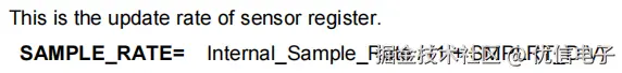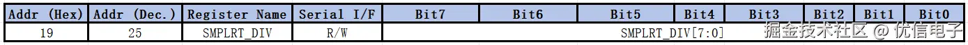 4、SMPLRT_DIV:采样率分频器,用于设置传感器数据采样的速率。将设置采样速率时钟通过这个寄存器进行分频,从而得到最终的数据采样率