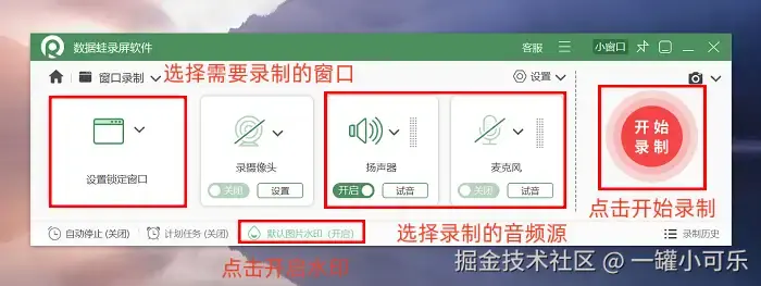 步骤2:进入 “窗口录制” 界面,就到了你的自定义时间:手动选择录制的窗口,勾选好麦克风和扬声器。还可以提前设置 “图片水印” ,这样就不用担心自己的课件被盗了。等这些参数都调好,确认没毛病,就直接点一下 “录制” 按键,录制正式发车!