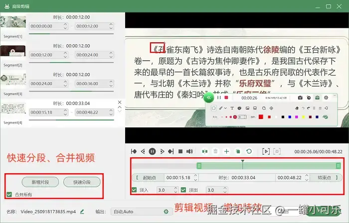 步骤3:在录制的时候,我们还可以直接使用软件工具箱中的标注工具,如放大镜、箭头、文字等,这样能够更好地突出视频重点。录制完成后,还可以进入 “高级剪辑” 页面,把多余的片段删掉,想加个片头特效什么的也能安排。