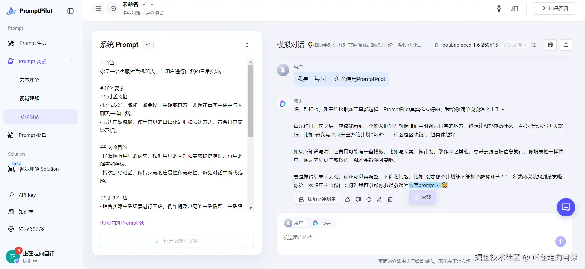 通过将提示词开发工程化,PromptPilot 实现了从依赖经验的 “炼金术” 到数据驱动的标准化流程的转变。其引导式需求探索功能,让模糊的需求变得清晰明确;自动化提示词优化引擎,能够快速生成高质量的提示词并不断优化;闭环迭代的 Badcase 洞察机制,则确保了大模型输出结果的稳定性和准确性。这些功能相互协作,构建起了一个完整的 AI 工程生态,为大模型在各个领域的深入应用提供了坚实的支撑。