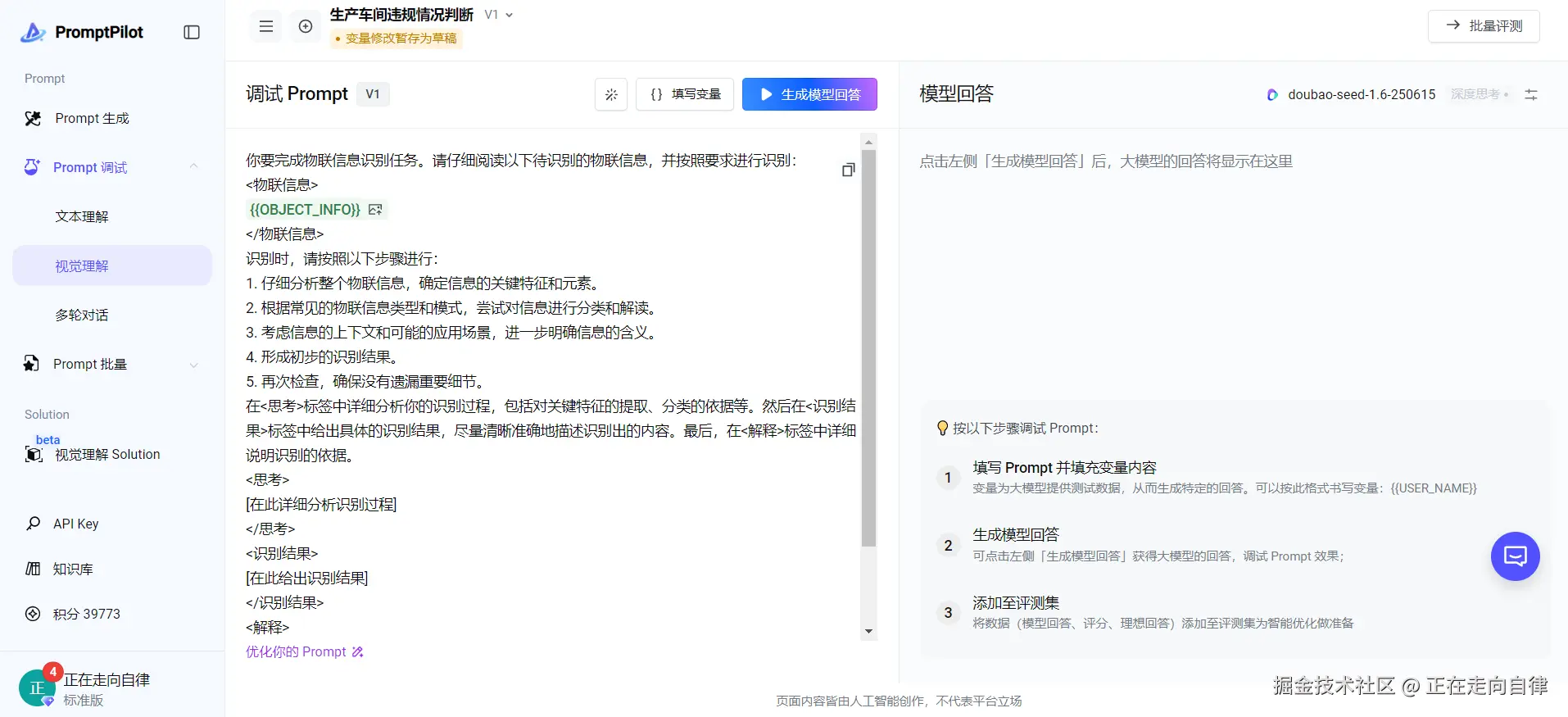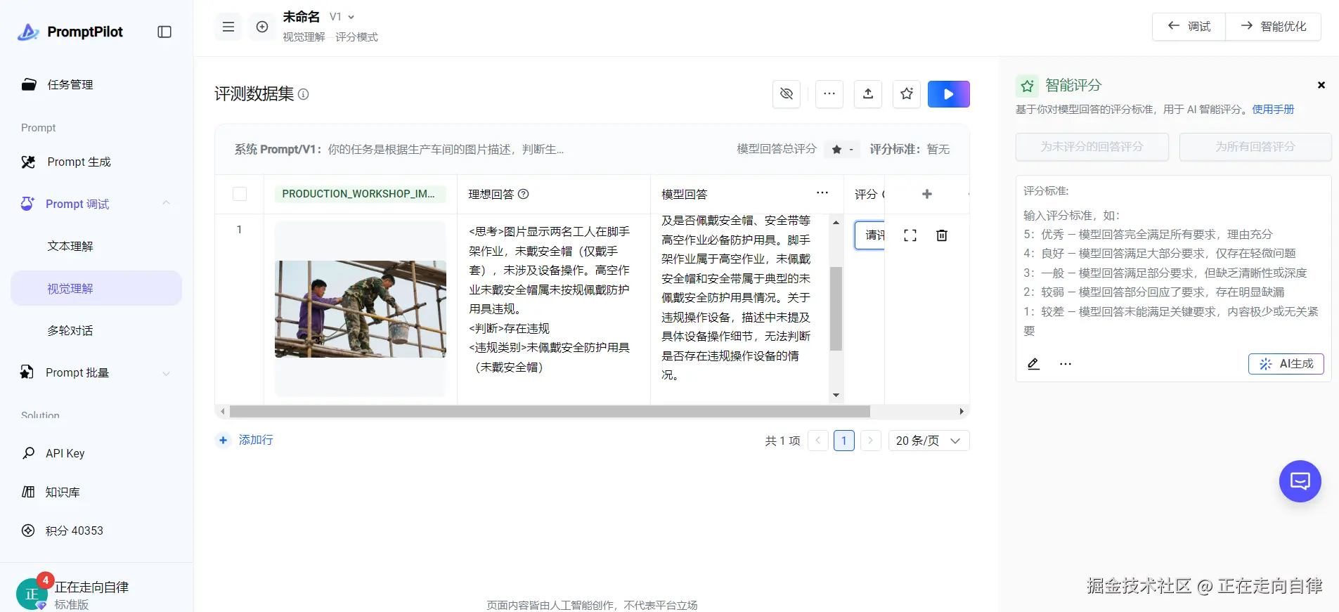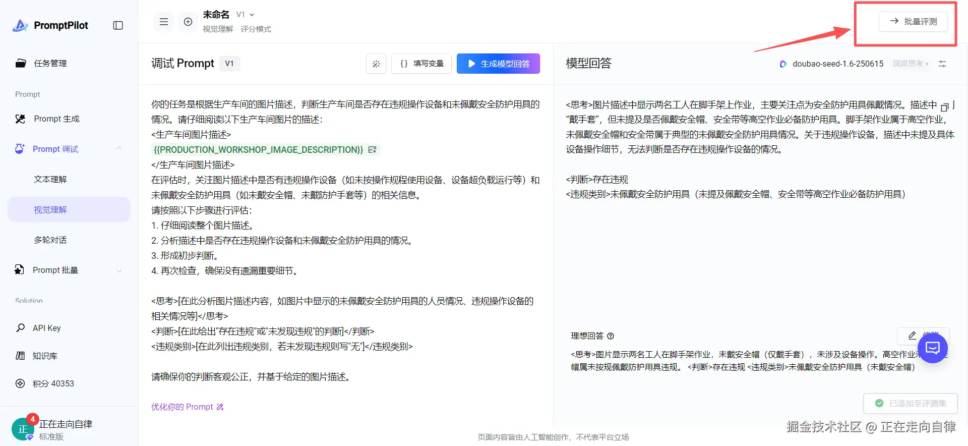 在实际安全生产管理中,面对大量生产车间图片的人工巡检工作,效率低、易遗漏,而 PromptPilot 的批量处理与智能调优功能恰好提供了一种高效、可迭代的解决方案。
