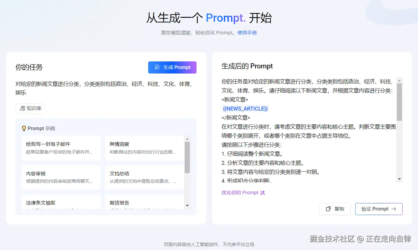 于是,我决定尝试使用 PromptPilot 来解决这个问题。我首先在 PromptPilot 中输入任务描述:“对给定的新闻文章进行分类,分类类别包括政治、经济、科技、文化、体育、娱乐”,然后点击生成 Prompt。PromptPilot 很快就为我生成了一个结构化的提示词,它详细地说明了分类的标准和要求,以及如何根据文章的内容进行判断和分类。