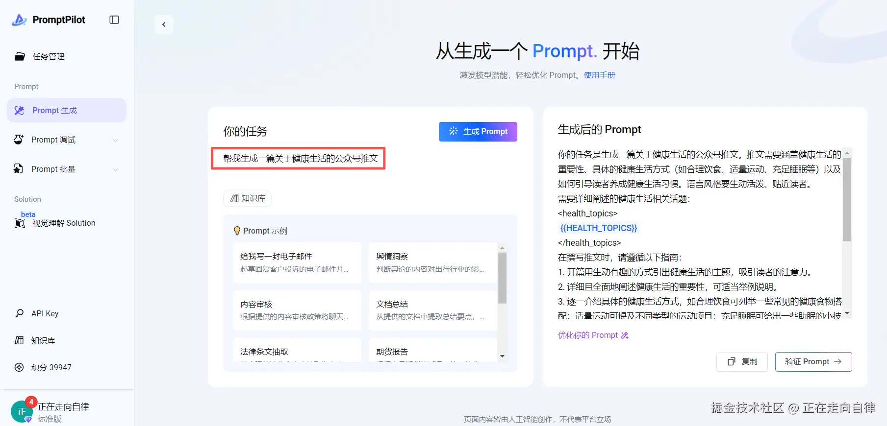 当我第一次打开 PromptPilot 的提示词生成界面时,就被它简洁而直观的设计所吸引。我试着输入了一个比较模糊的需求:“帮我生成一篇关于健康生活的公众号推文”,点击生成按钮后,短短几秒钟,PromptPilot 就为我输出了一个结构化的 Prompt。
