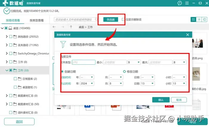 步骤2: 软件左上角显示“扫描完成”之后,我们就能在指定的位置根据自己的需求选择恢复文件了;如果直接扫描一整个存储设备的文件,很容易显示出一大堆文件,这时候我们可以选择使用“筛选器”“搜索框”等工具来进一步缩小文件搜索范围。