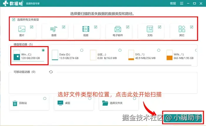 步骤1: 在软件的首页上根据自己的丢失数据类型进行选择,选好后还需要选择丢失文件的文件存储位置,这两项都选择完毕后,再点击“扫描”按钮。