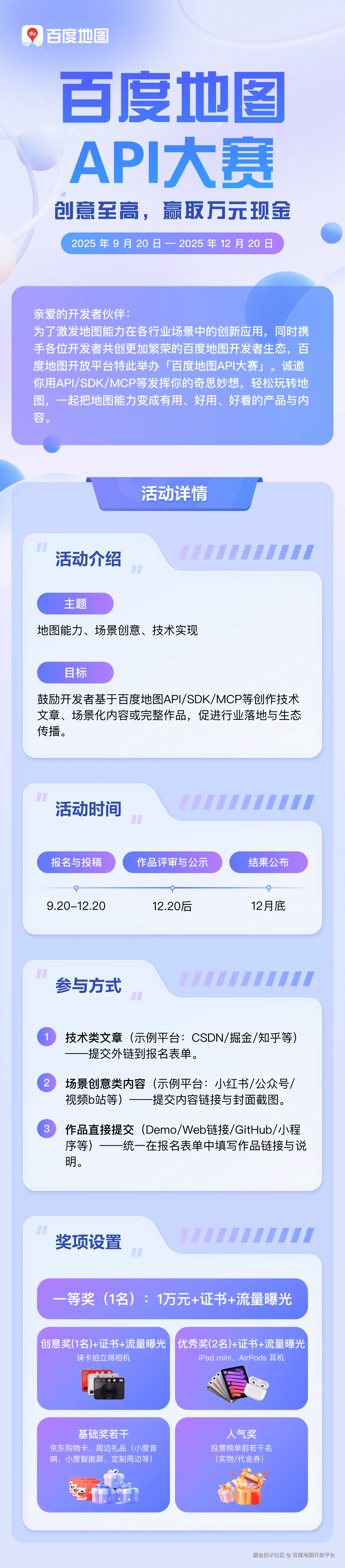 欢迎开发者将作品分享到更多社区平台(如小红书、微信视频号、B站、公众号、CSDN、掘金、GitHub、知乎、博客园、微博、百家号等),展示你的技术实力与创意火花,带动更多开发者一起探索地图能力的创新应用!
