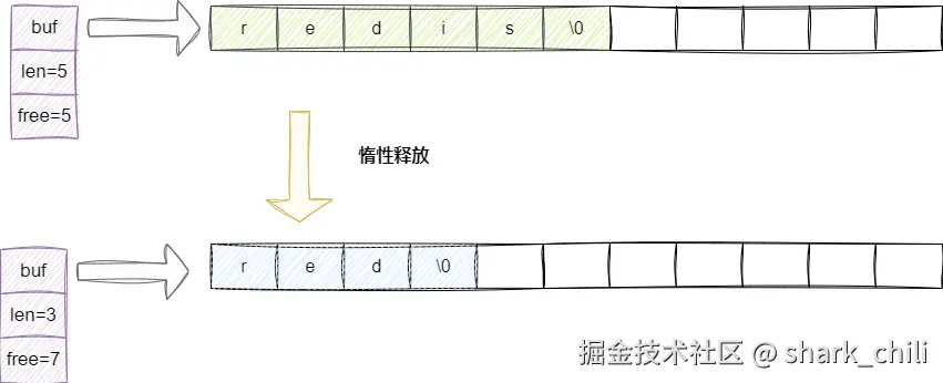 - 惰性空间释放:在字符串缩短时,SDS不会立即释放空间,而是保留在