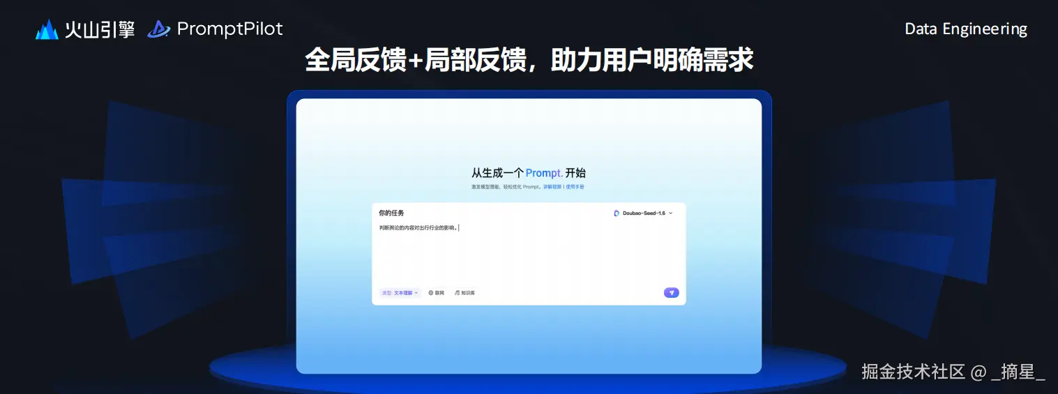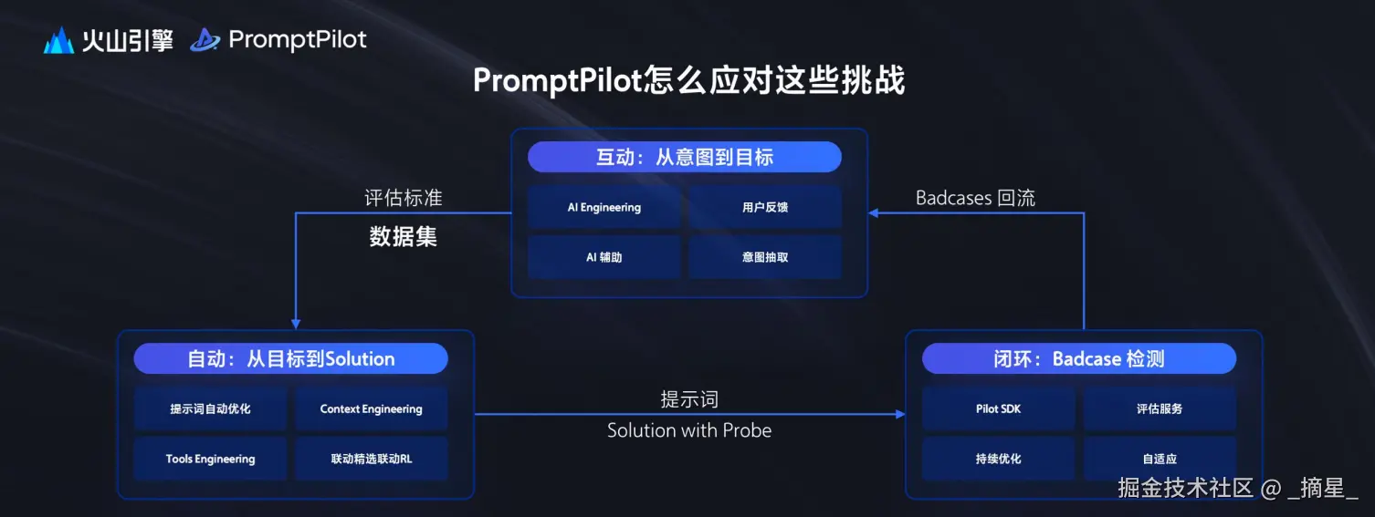 作为一名深耕AI领域多年的技术工作者,我有幸在9月13日受邀参加了火山引擎PromptPilot产品发布会。这场发布会不仅让我见证了国产AI应用的重大突破,更让我深刻体会到大模型应用落地正在从理论走向实践。许伟技术负责人和王铁飞算法工程师的精彩演讲,为我们揭示了当前大模型应用面临的核心挑战以及PromptPilot如何通过创新的三层架构和三大数据工程来解决这些痛点。从产品发布会的内容来看,PromptPilot通过"互动-自动-闭环"的设计理念,结合Question Engineering、Answer Engineering、Context Engineering三大数据工程,为大模型应用落地提供了全面的解决方案。这不仅解决了传统提示词工程中的效率问题,更实现了从用户意图到最终解决方案的自动化优化流程,真正做到了让AI应用开发变得高效且智能。