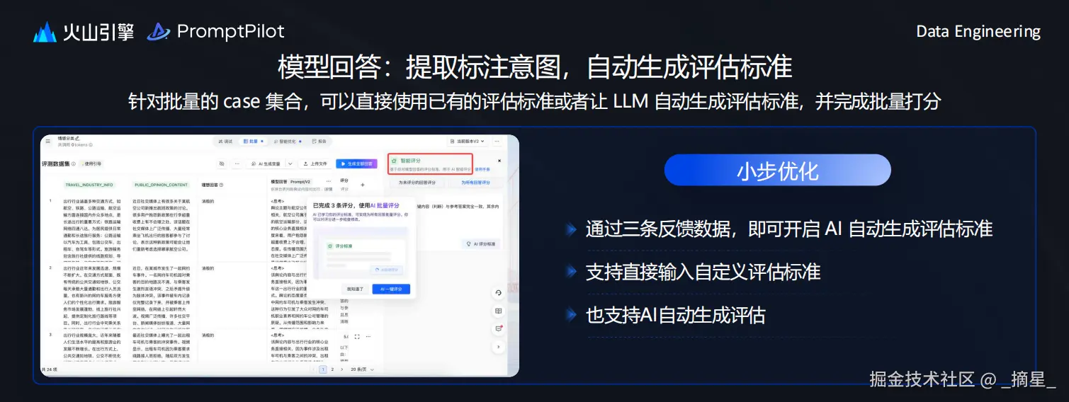 1. **多模型协同生成** - 利用多个模型协同生成参考答案,提供多样化选择 2. **对比选择机制** - 客户可以通过对比、选择、反馈获取理想回答 3. **智能评估标准** - 通过三条反馈数据即可开启AI自动生成评估标准 4. **批量处理能力** - 支持批量case的自动化评分功能名称-模型回答:提取标注意图,自动生成评估标准