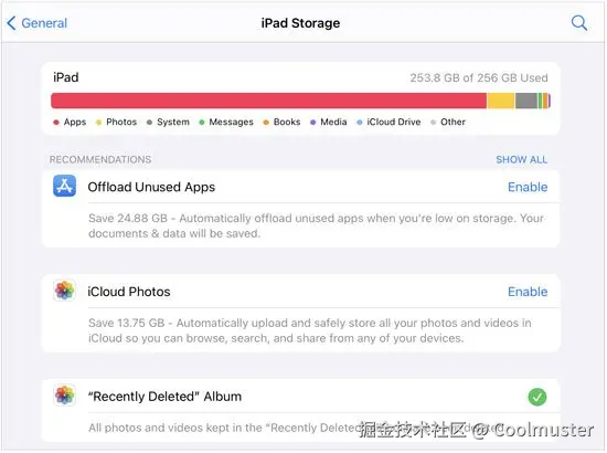 您还可以在 iPad 上启用自动卸载未使用应用程序的设置。具体操作如下:前往“设置”>“通用”>“iPad 存储”,在“建议”下,您将看到“卸载未使用应用程序”选项,然后启用它。