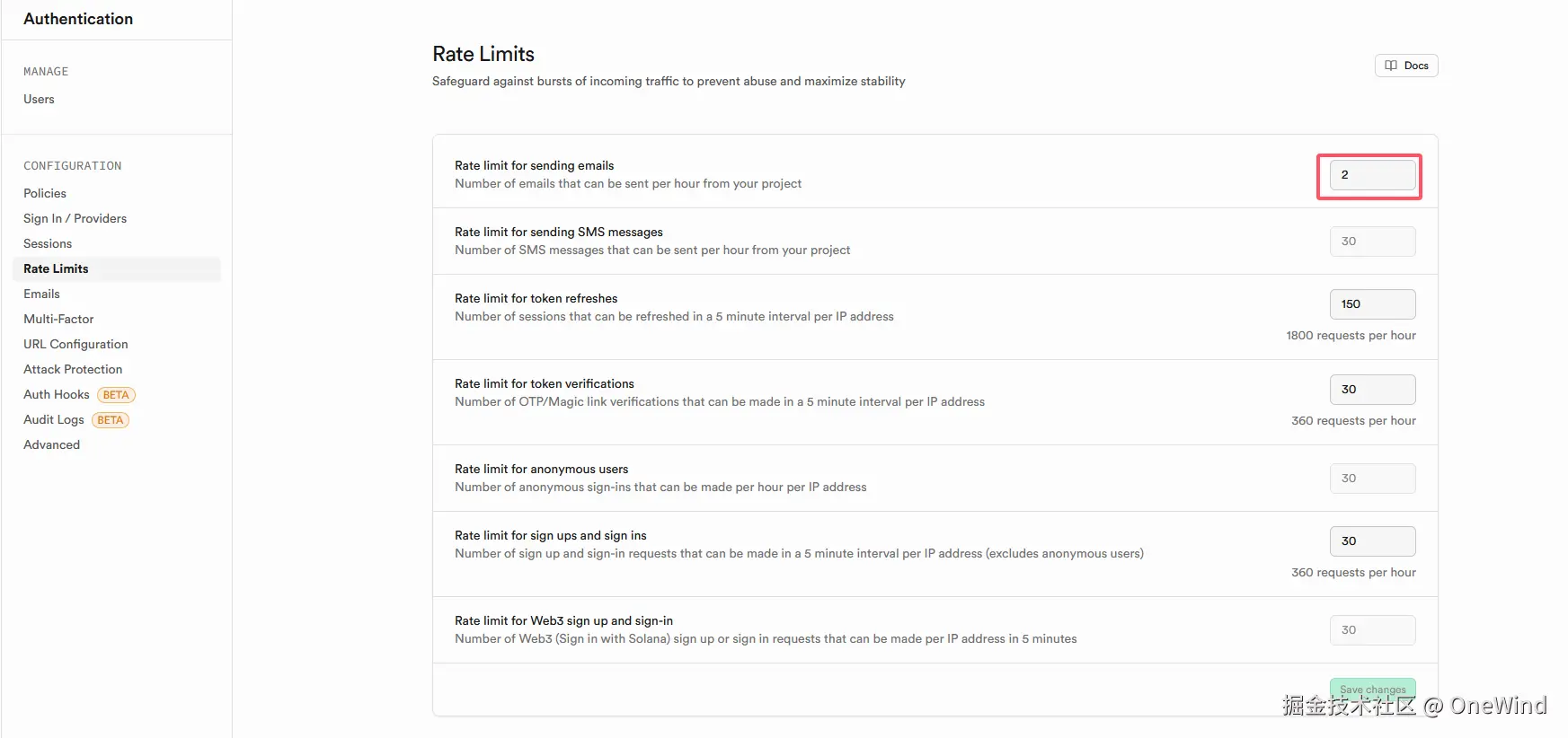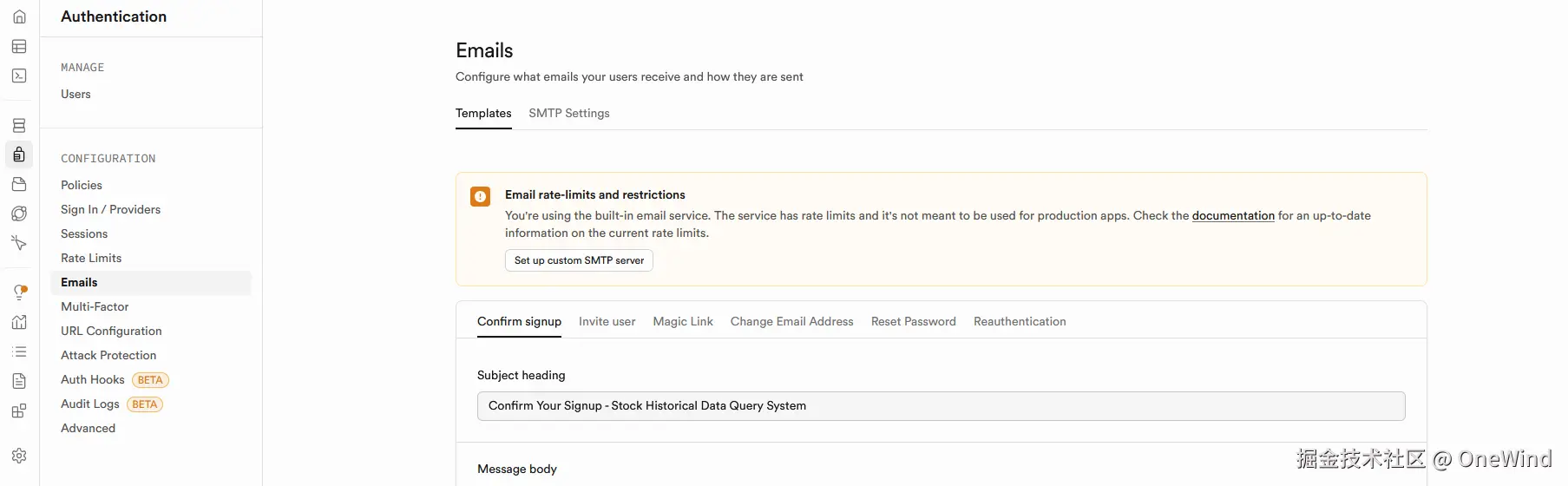 Supabase 是一个很棒的开源项目!它是一个使用 PostgreSQL 数据库的 Firebase 替代品,提供了后端即服务(BaaS)的功能。 使用Supabase能够快速给自己的网站提供登录,注册认证服务,但是Supabase默认的邮件服务有很多Rate Limits,比如每小时只能发2封,每天发邮件也有限制。所以我们必须换成自己的邮件地址,这样也显得更专业。 登录Subapase,打开自己的项目,在Authentication下找到Emails,启用Smtp Setting