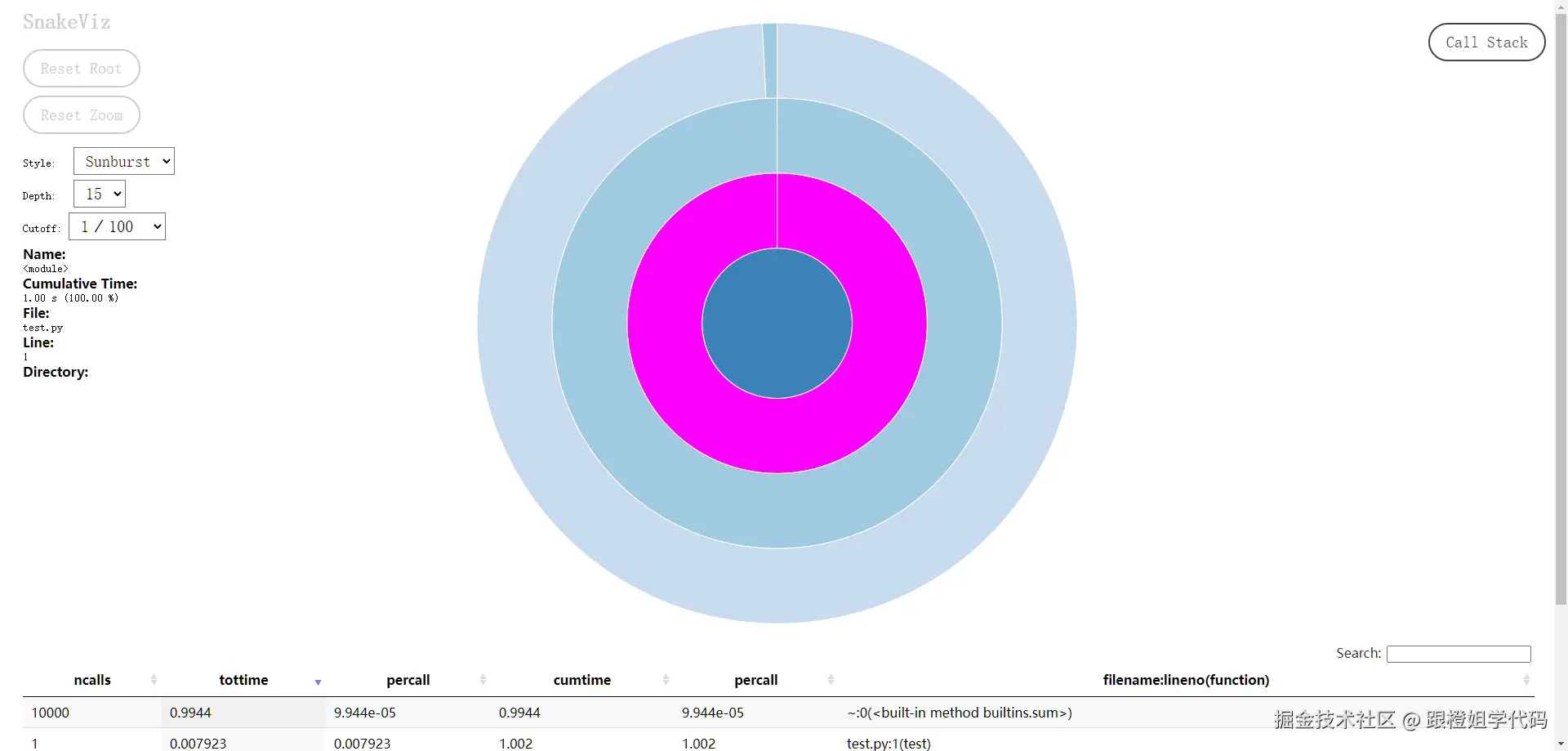 ncalls tottime percall cumtime percall filename:lineno(function) 1 0.000 0.000 0.008 0.008:1() 1 0.000 0.000 0.008 0.008 test.py:4(test) 1 0.000 0.000 0.008 0.008 {built-in method builtins.exec} 1000 0.008 0.000 0.008 0.000 {built-in method builtins.sum} 1 0.000 0.000 0.000 0.000 {method 'disable' of '_lsprof.Profiler' objects}