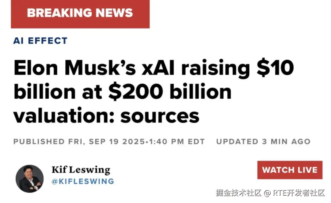 据报道,Elon Musk 旗下人工智能公司 xAI 正以约 2000 亿美元 估值进行一轮超过 100 亿美元的融资。