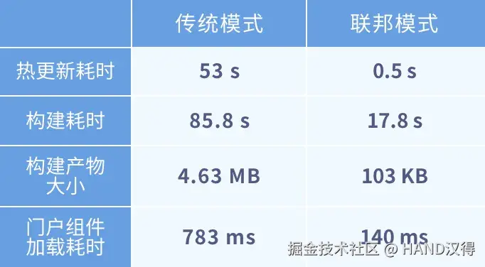 经多次试验对比,结果如下表所示,使用联邦模式开发门户自定义组件各方面性能均大幅度优于使用传统组件开发模式。