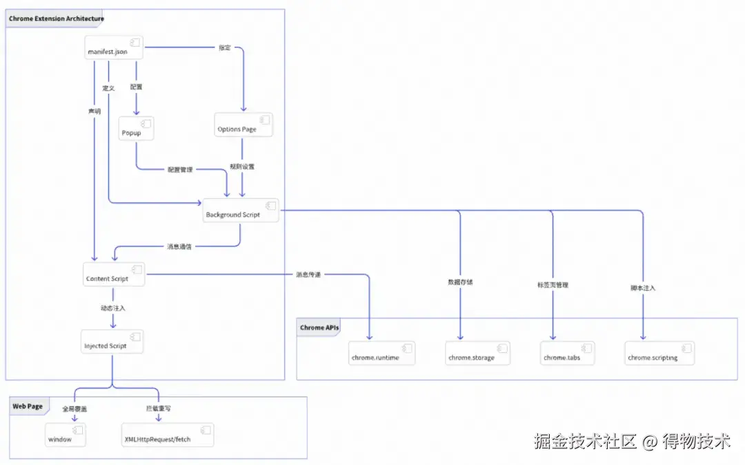 关键架构变革:V3 采用"静态声明+内核级处理"模式替代 V2 的"动态脚本+插件自主控制"模式,通过浏览器内核直接介入关键流程(如网络拦截),在性能与安全性之间取得平衡。