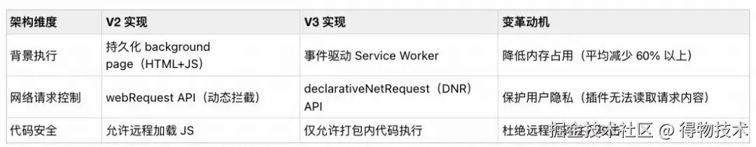 Manifest V3 对浏览器插件的底层架构进行了颠覆性重构,主要体现在背景执行机制、网络请求控制和代码安全模型三个核心维度。以下从技术实现与设计动机角度进行全面对比: