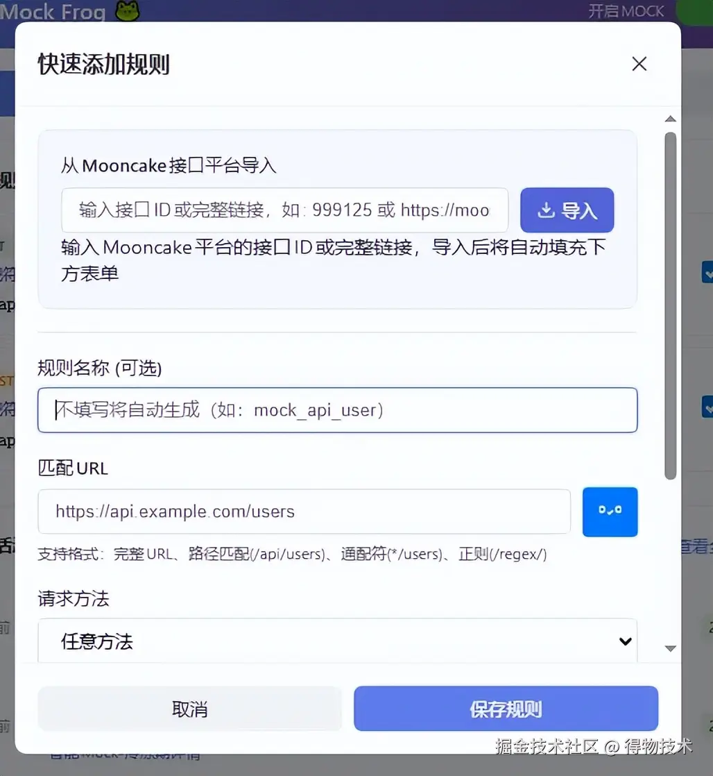 方式二:复制接口地址到匹配 URL 输入框中自行配置数据,这一步建议到管理规则中才施展的开。