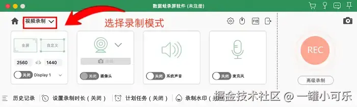 步骤1:Mac怎么录制屏幕?首先在电脑的桌面或程序列表中,找到数据 蛙录屏软件的图标,双击图标启动软件。进入软件主界面后,根据自身录制需求,在提供的模式中选择对应的类型,例如日常录屏常用的 “屏幕录制” 模式。