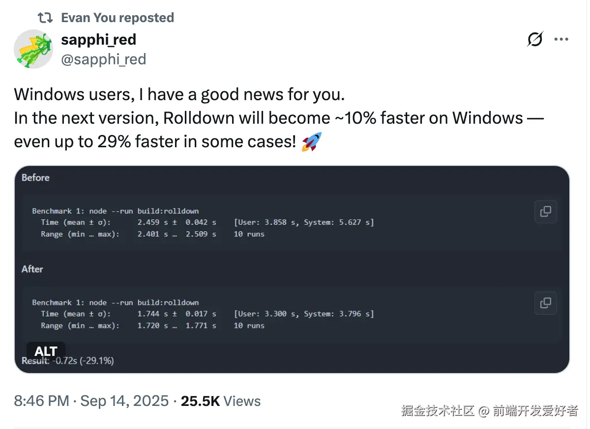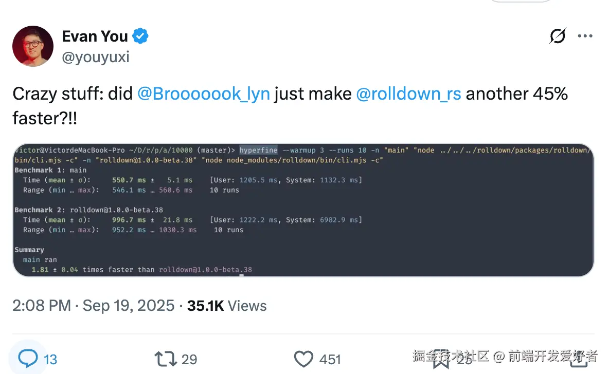 尤雨溪在推特上连续转发两则基准测试,确认 Rolldown(Vite 未来核心引擎)已把构建时间压到极致!