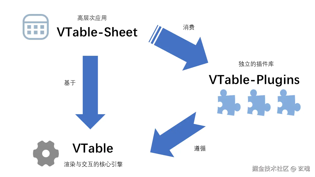 - VTable (核心引擎) :作为整个系统的基石,VTable 是一个高性能的表格渲染与交互引擎。它提供了底层的表格组件 ListTable 和一套标准的插件接口。