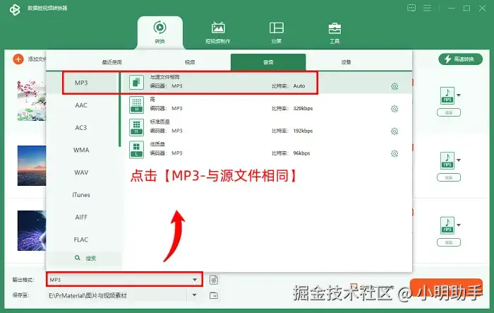 步骤二: 点击【输出格式】,可以将视频文件的目标格式更改为【音频】选项卡的【MP3-与源文件相同】格式选项。