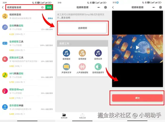 步骤:在微信的搜索框中,搜索【视频提取音频】【视频转mp3】【mp4转mp3】的关键词,之后选择你喜欢的某个小程序,进入小程序之后,点击【选择视频】并上传视频文件,最后点击【提交】。